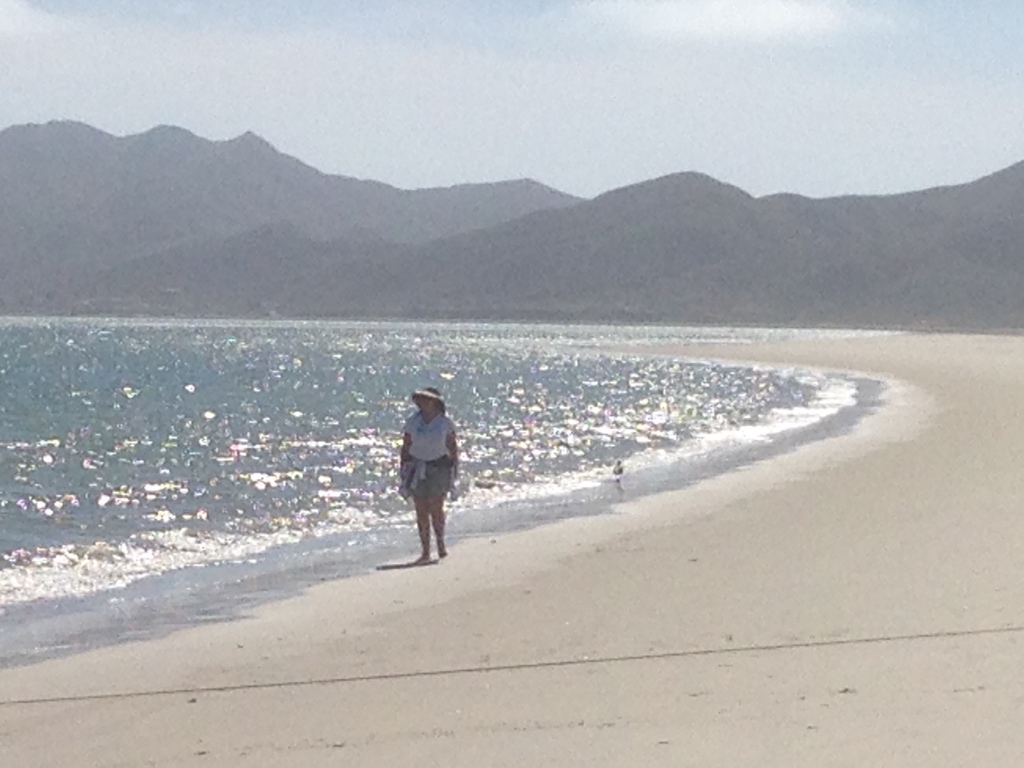 One evening, several of us were beach-combing at sunset along the sandy shore of a narrow cove where we’d been forced to lay over for a day due to high winds.  The cove was otherwise deserted, but out of nowhere we were approached by a sturdy, barefooted individual in shorts and a tee-shirt, walking up the beach toward us.  Earlier, we had noticed a small fishing camp rigged further up around the bend, a white dory pulled up above the tide-line and a blue tarp held up with rope tied to a piece of driftwood – or maybe the boat’s oar – stuck in the sand.  At any rate, Sarah, our naturalist-guide, knows enough Spanish to learn that he had been out fishing with his two compadres the day before, and had been forced into harbor by the strong winds, as had we.  They were expecting to make their way out in the morning, as the winds were beginning to lay down with the fading sun.  Sarah learned that they had enough water, and plenty of fish to eat, and introduced us as neighbors, lying at anchor in this quiet place.  With a broad smile flashing his white teeth, he introduced himself as Antonio, and made a friendly effort to shake everyone’s hand and repeat our names with his heavy accent.  Soy Tony!” he declared with apparent pride to each of us in turn.